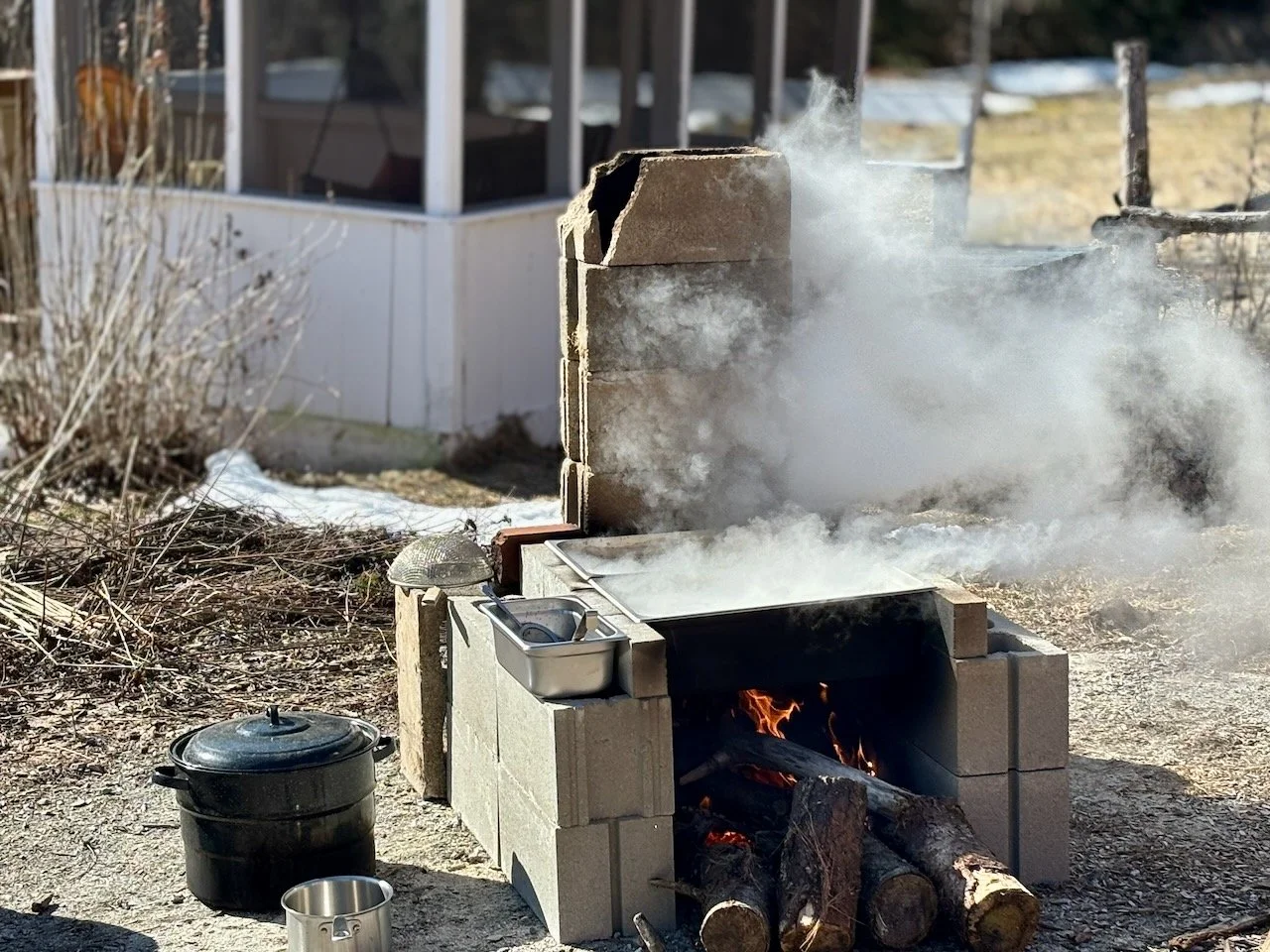 This year we built a homemade evaporator, which has been a genuine improvement. But the upgrade doesn't change the fundamental nature of the work: you boil, and you wait. Fifty gallons of sap makes about a gallon of syrup, and you get there by maintaining a steady boil for several hours and not rushing it. That's the whole job.